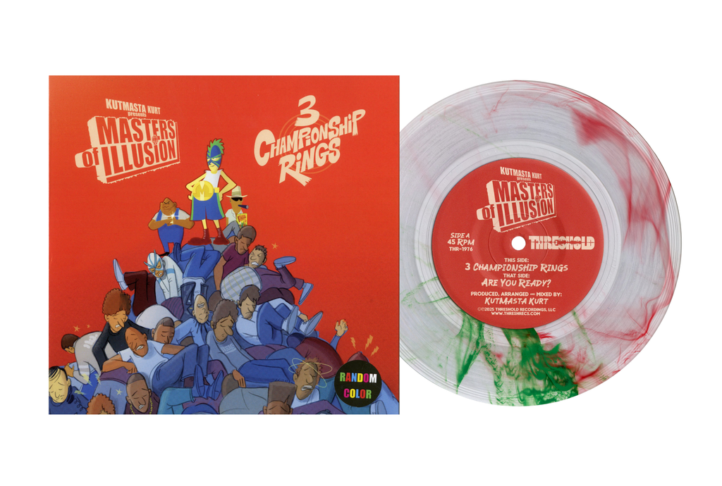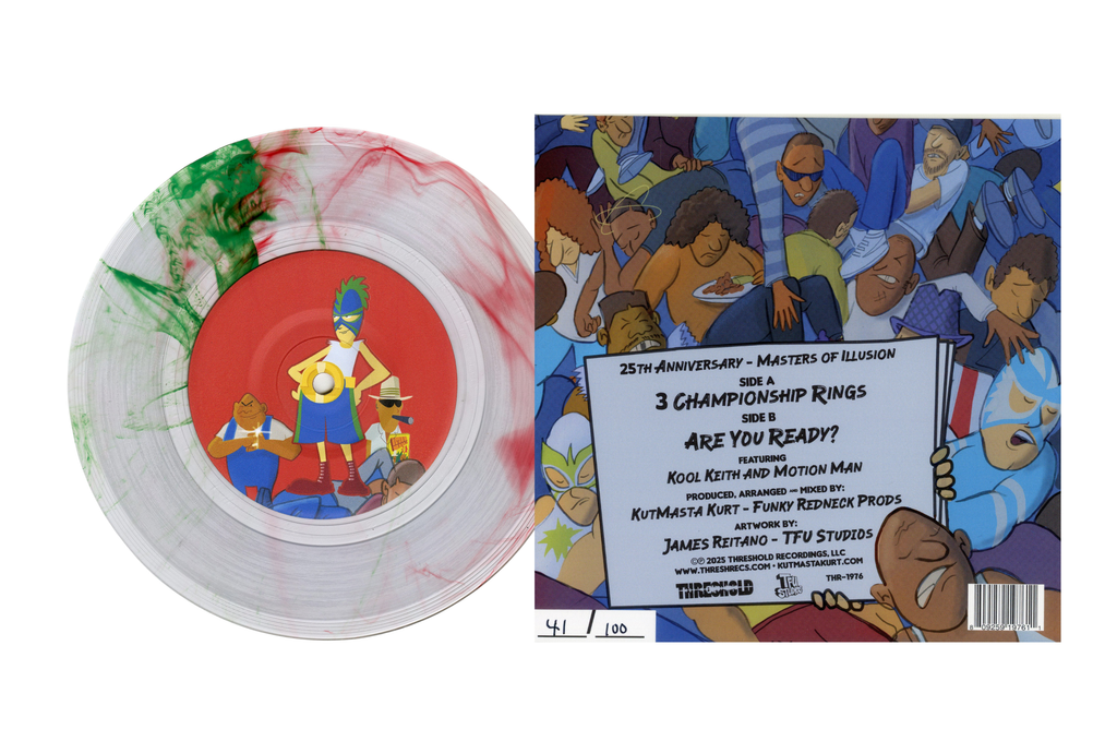 To commemorate the 25th Anniversary of KutMasta Kurt presents Masters Of Illusion featuring Kool Keith and Motion Man, Kurt digs into his archives to unearth 2 dope previously unreleased tracks. This Special Limited Edition release of 100 copies comes on Random-Colored Vinyl with Full-Color Labels and Fresh Cover Artwork by James Reitano, perhaps best known for his brilliant Animation of the "All Caps" Video by Madvillain.